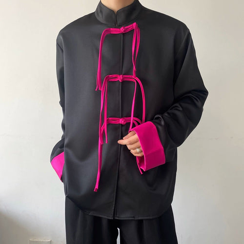 Contrast Buttoned Stand Collar Long Sleeve Retro Shirt