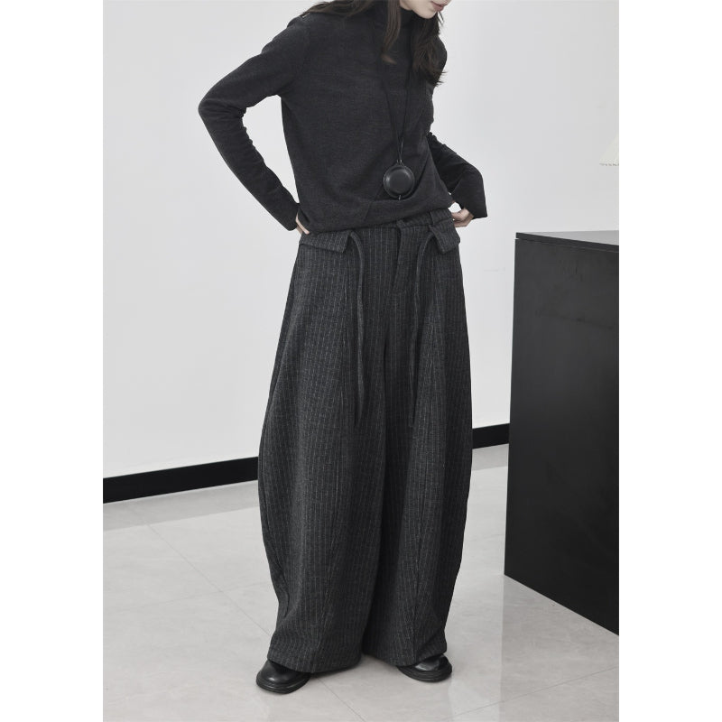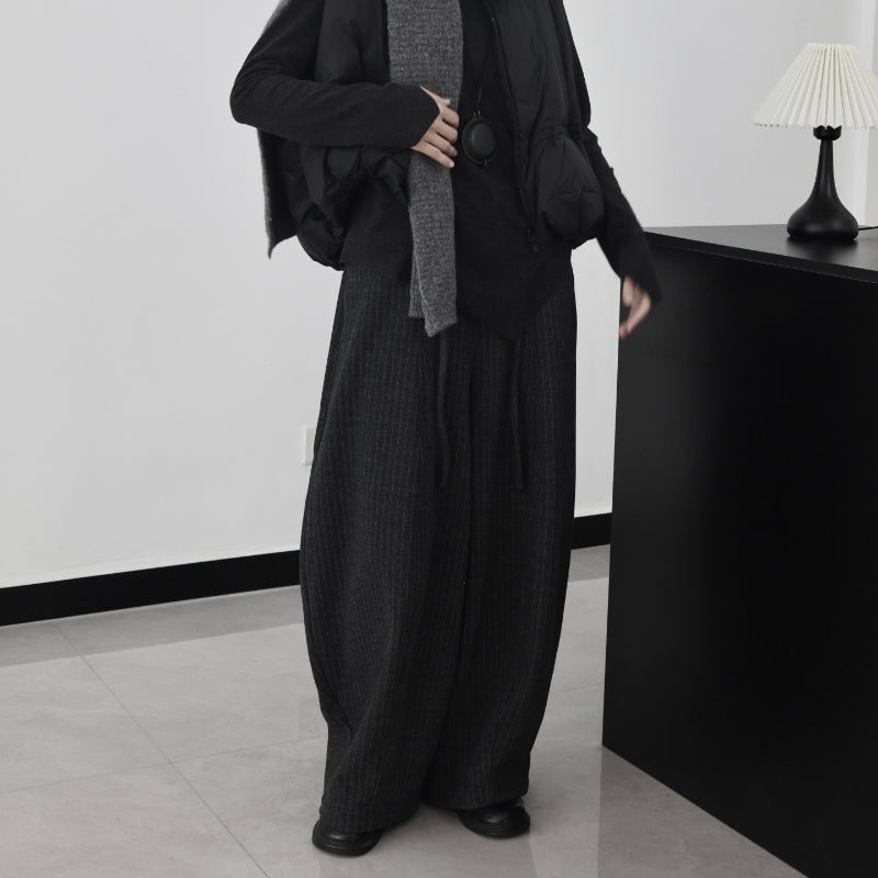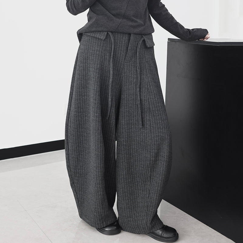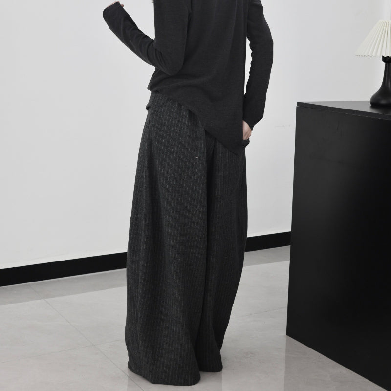 Striped Gray Loose High-waisted Thick Fleece Lining Pants